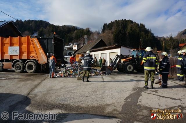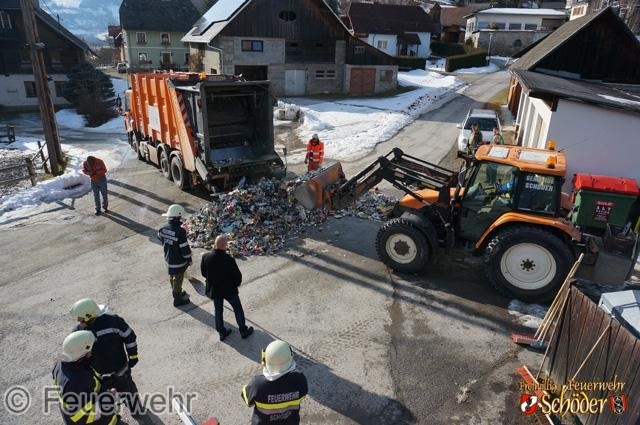 Beim Eintreffen wurde der Laderaum des Müll LKW geöffnet und mittels HD Rohr der Brand rasch gelöscht. Da der Brandherd nicht sofort ersichtlich war, musste ein Großteil der Ladung (Metalldosen) entleert werden.